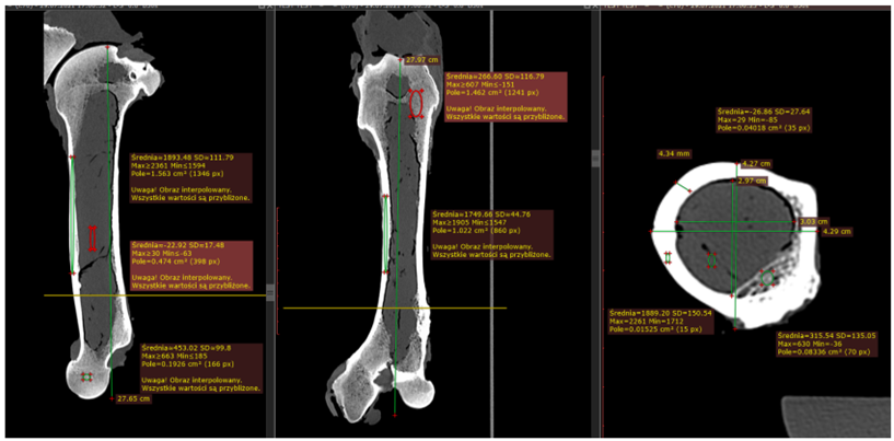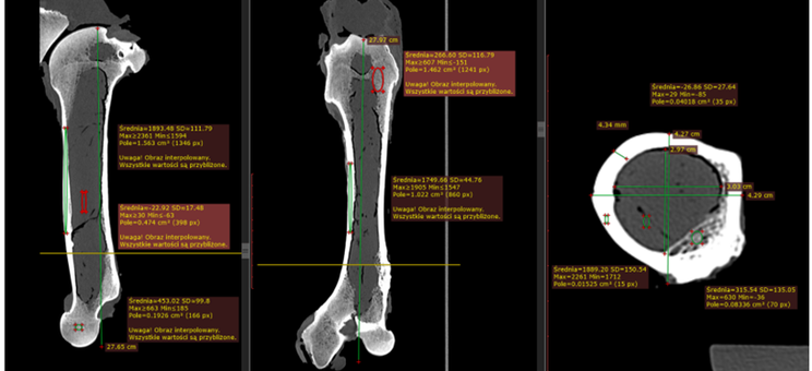 Pomiary modułu Younga wykonane zostały za pomocą dwóch metod: maszyny wytrzymałościowej INSTRON oraz za pomocą metody bazującej na dyfrakcji światła. Pomiaru gęstości mineralnej kości dokonano za pomocą tomografu komputerowego z wzorcowym fantomem gęstości kości.